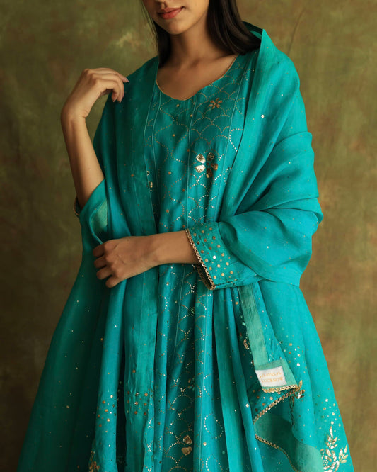 Green & Blue Noor Organza Chikankari Anarkali Kurta With Dupatta