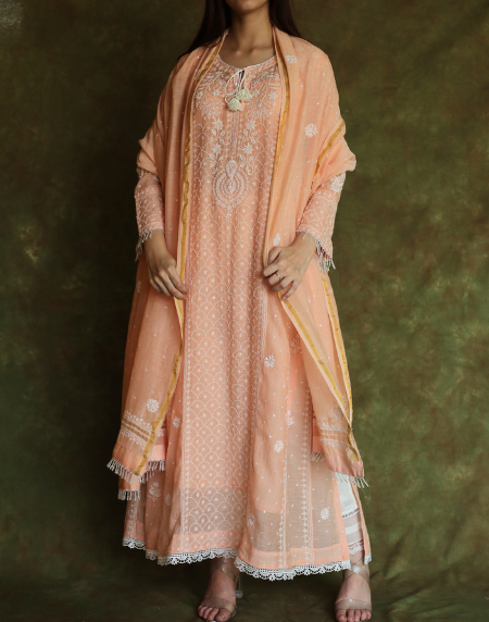 Peach & White Mulmul Pearl Work Chikankari Anarkali With Dupatta