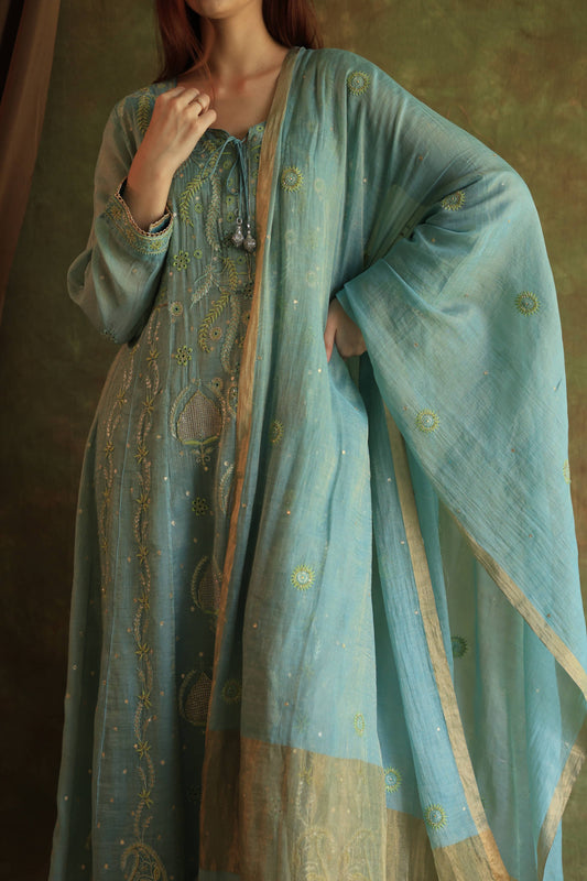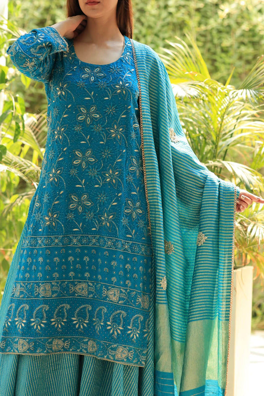 Blue Banarasi Noor Organza Chikankari Kurta With Dupatta