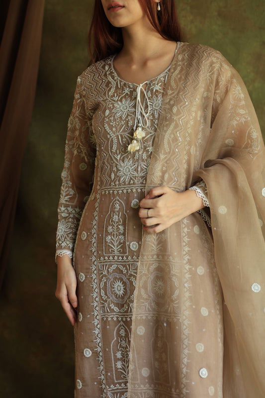 Grey Taupe Shade Noor Organza Chikankari Anarkali With Dupatta