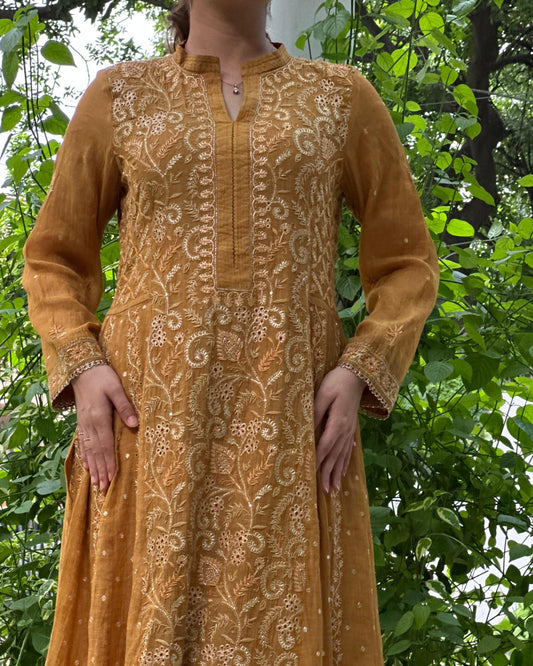 Mustard Yellow Tissue Silk Chikankari Anarkali