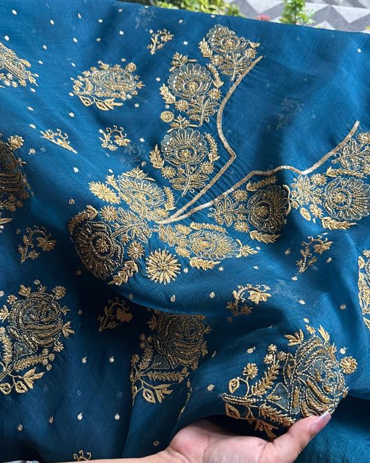 Prussian Blue Noor Organza Silk Chikankari Unstitched Kurta Dupatta Set