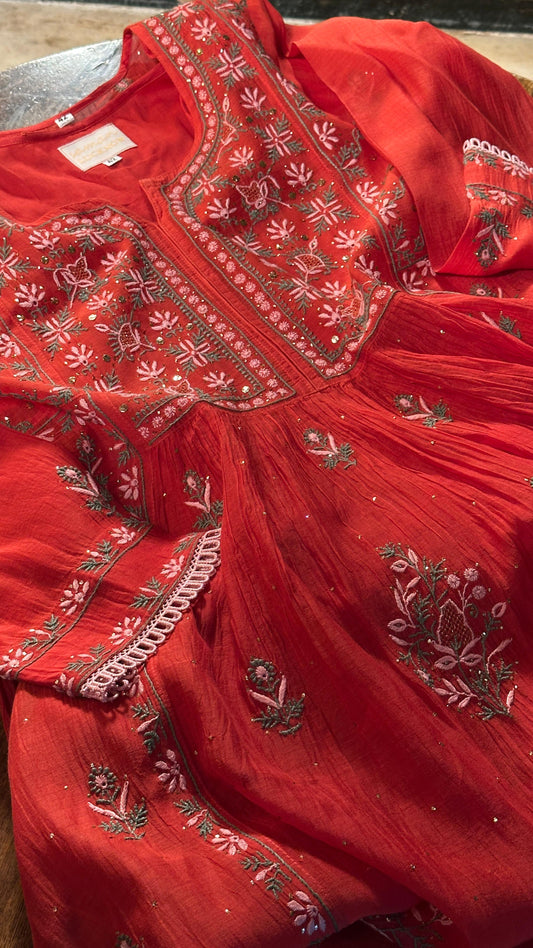 Saman Tomato Red | Malmal Mukaish Kamdani Chikankari Stitched Kurta Dupatta Set