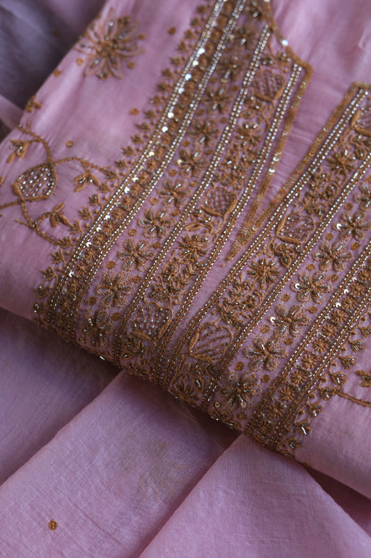 Pink & Mustard Mal Chanderi Silk Chikankari Unstitched Fabric