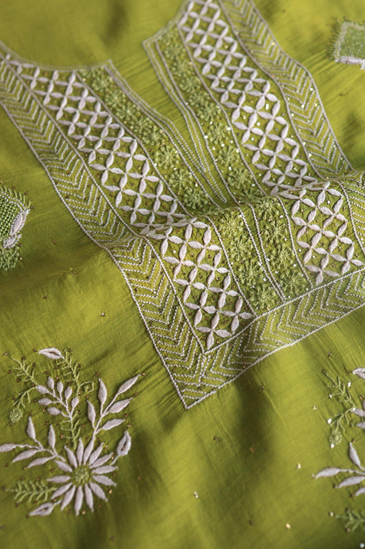 Mehndi Green Mal Cotton Fine Chikankari With Kamdani Work Unstitched Fabric