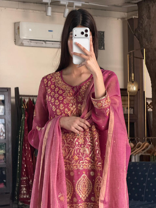 Hot Pink Shade Tissue Silk Chikankari Anarkali With Ari Work