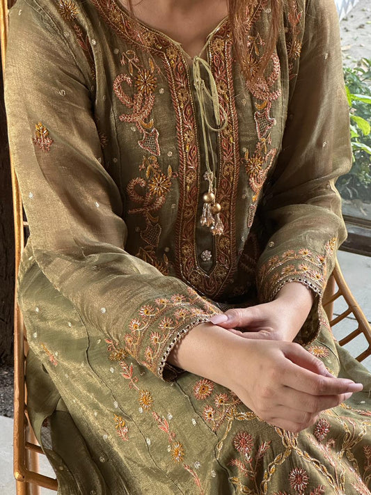 Green Shade Tissue Silk Chikankari Anarkali With Ari Work