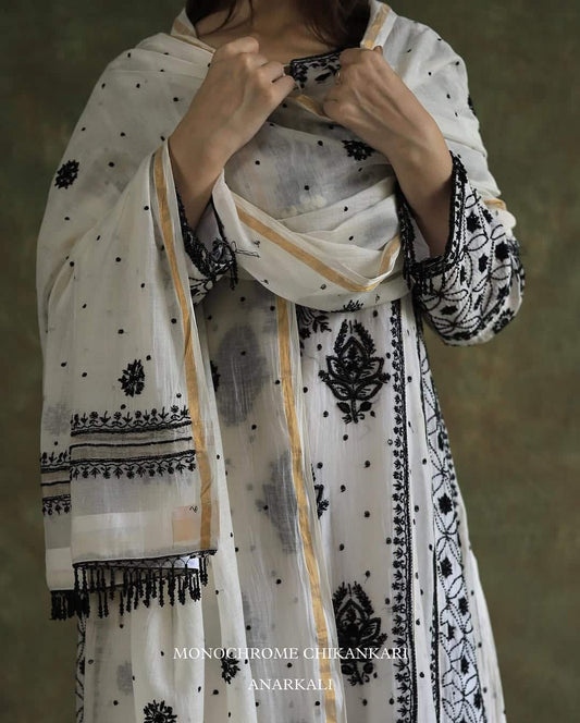 Monochrome Black & White Malmal Pearl Work Chikankari A Line Kalidar Kurta With Dupatta