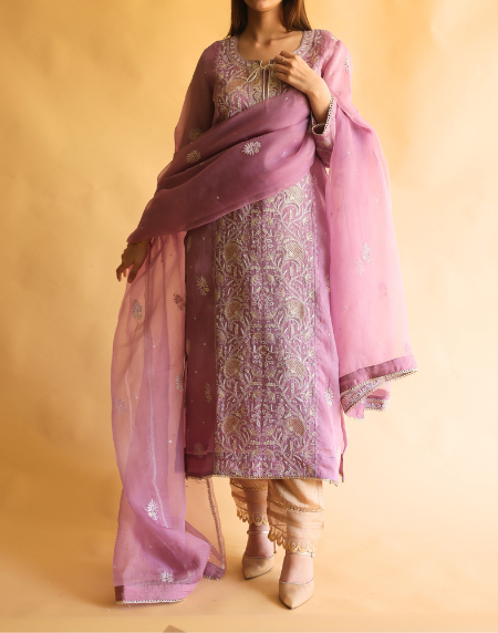 Lavender Noor Organza Mukaish Kamdani Chikankari Kurta Set