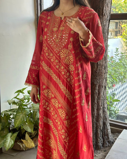 Ruby Red Malmal Pearl Work Chikankari A Line Kalidar Kurta With Dupatta