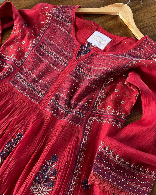 Saman Watermelon Red | Malmal Mukaish Kamdani Chikankari Stitched Kurta Dupatta Set