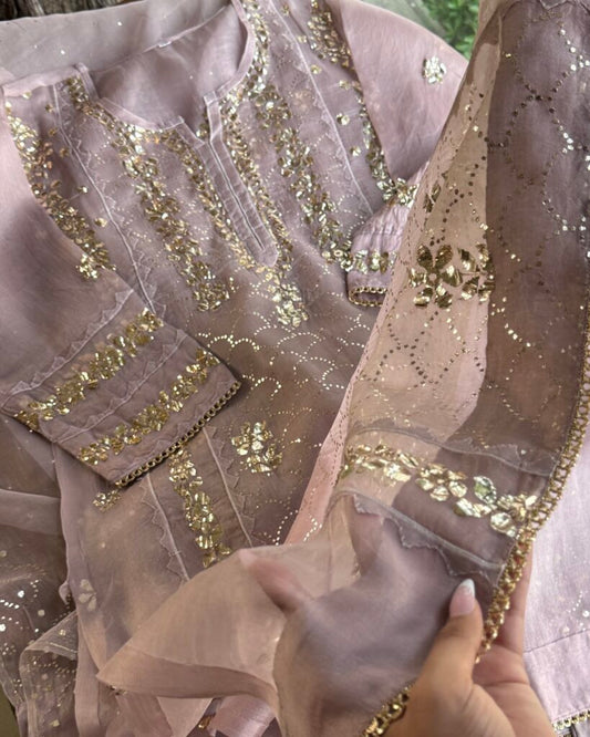 Green & Soft Pink Shade | Malmal Mukaish Kamdani Chikankari Stitched Kurta Dupatta Set