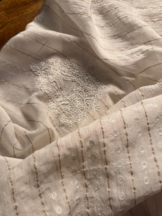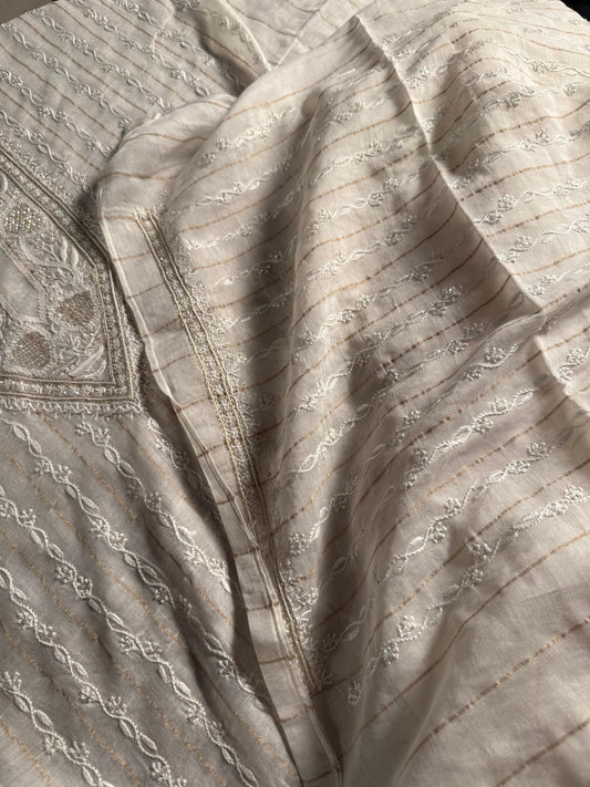 White Zari Chanderi Unisex Chikankari Unstitched Men’s Kurta Fabric