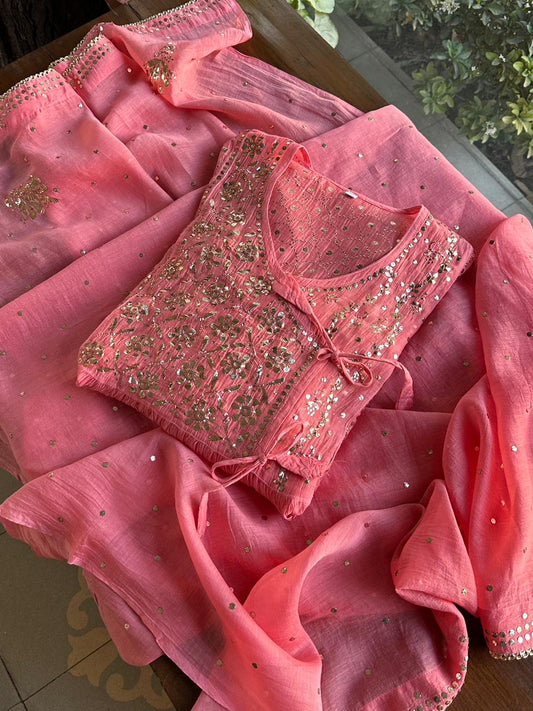 Carrot Pink Mukaish Mul Chanderi Silk Ready To Wear Dress