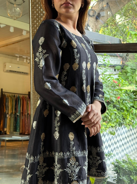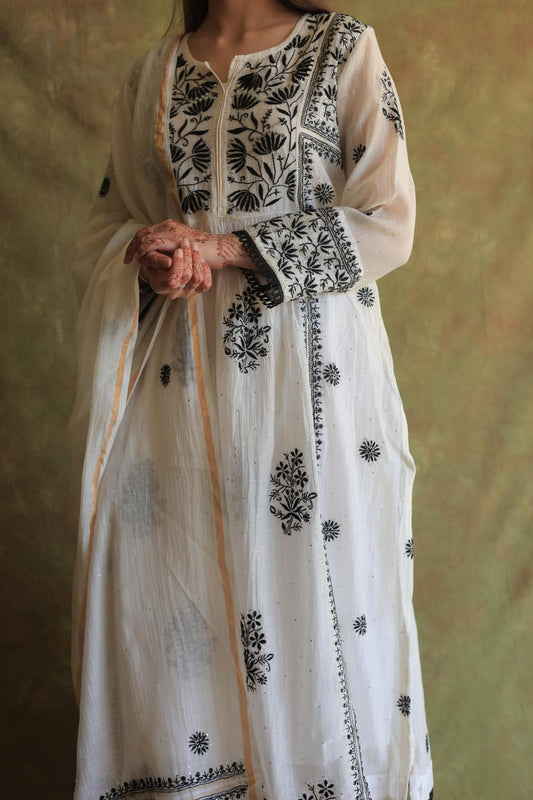 Monochrome Mul Chanderi Mukaish Kamdani Chikankari Stitched Kurta Dupatta Set