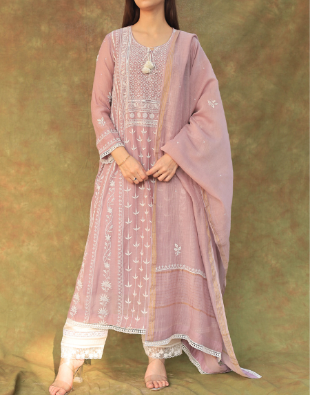 Light Mauve Mulmul Pearl White Chikankari Ready To Wear Kurta Dupatta Set