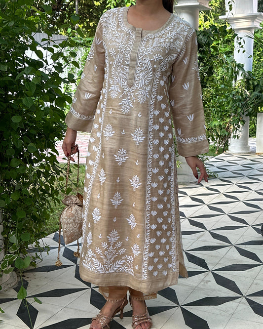 Natural Tussar Silk Chikankari Ready to Wear Kurta Dress