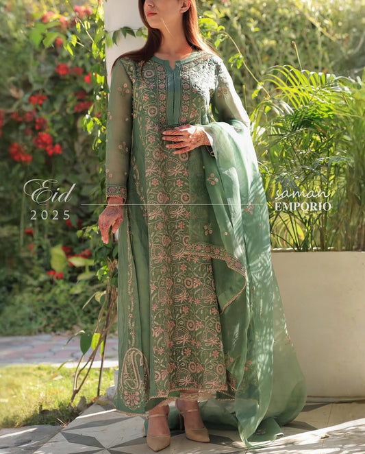 Raw Mango Green Noor Organza Chikankari Anarkali With Dupatta