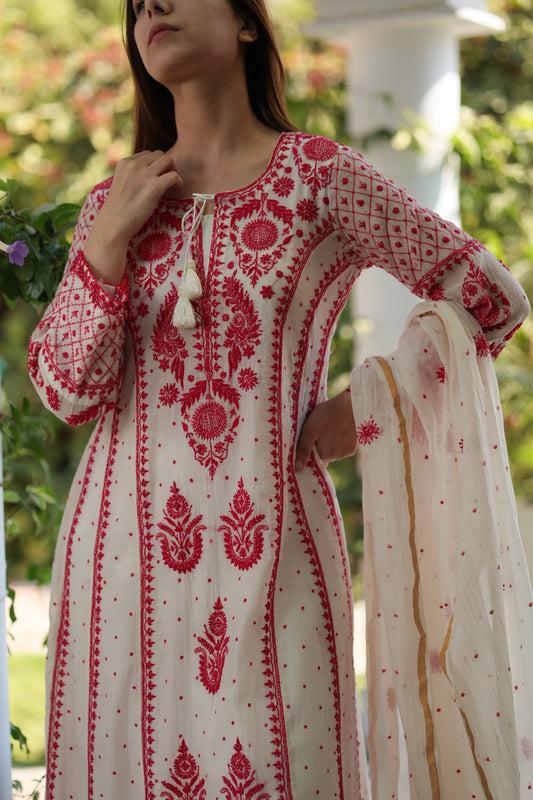 White & Red Malmal Pearl Work Chikankari A Line Kalidar Kurta With Dupatta
