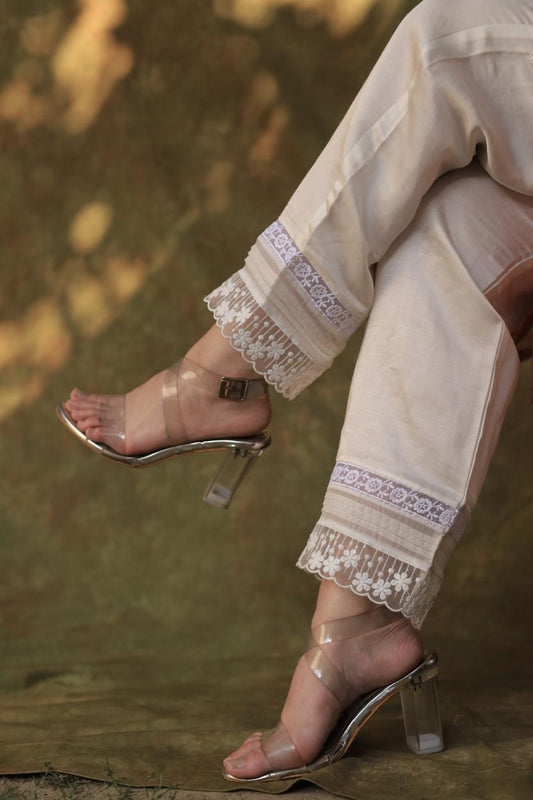 Beige Satin Linen Straight Pant With Organza Lace & One Side Pocket