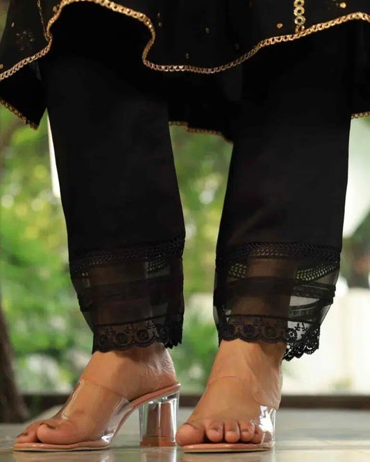 Satin Linen Black Straight Pant With Organza Lace & One Side Pocket