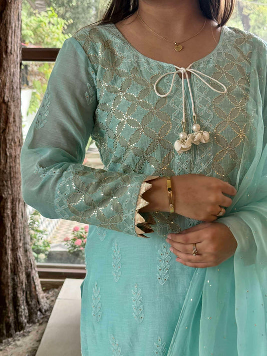 Sea Green Daraz Applique Chikankari Mukaish Kurta Dupatta Set