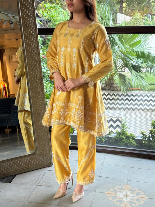 Yellow Zari Chanderi Chikankari Co-Ord Set
