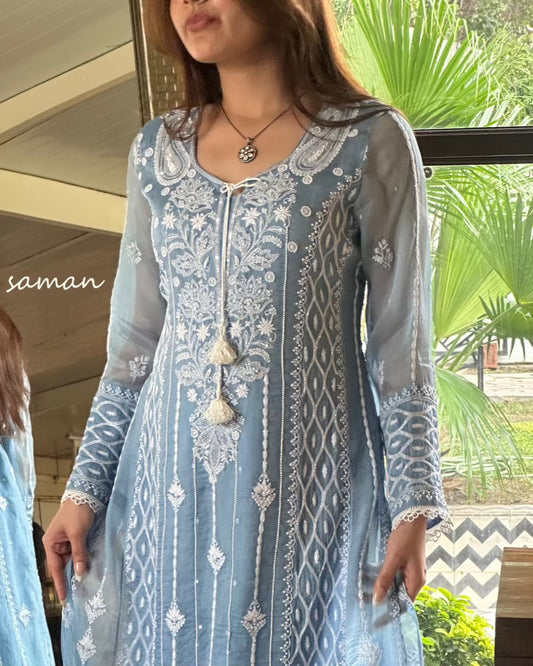 Powder Blue Shade Noor Organza Chikankari Anarkali With Dupatta