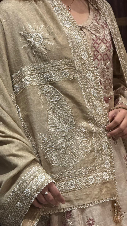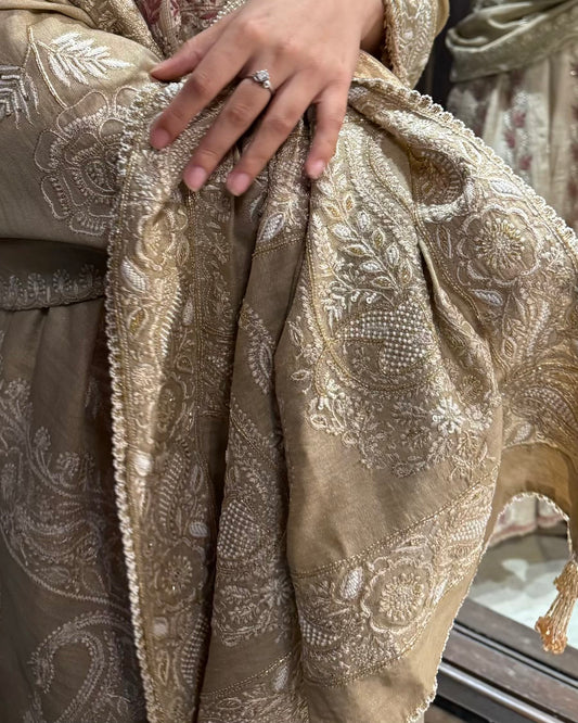 Natural Beige Shade Fine Chikankari Ari Tissue Silk Dupatta