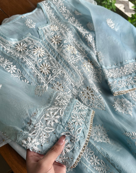 Powder Blue Noor Organza Applique Chikankari Mukaish Kurta Dupatta Set