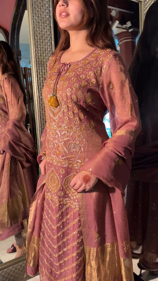 Rust Rose Shade Tissue Silk Chikankari Anarkali With Ari Work