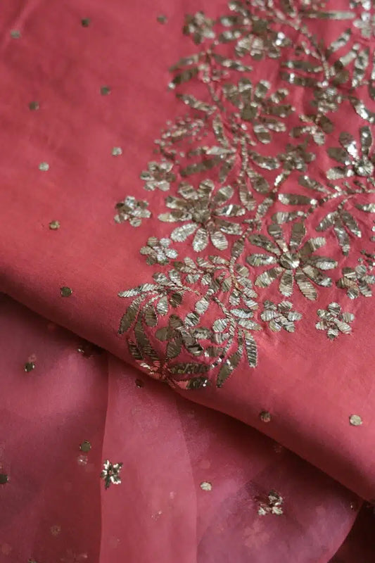 Carrot Pink Chanderi Silk Mukaish Badla Unstitched Fabrics
