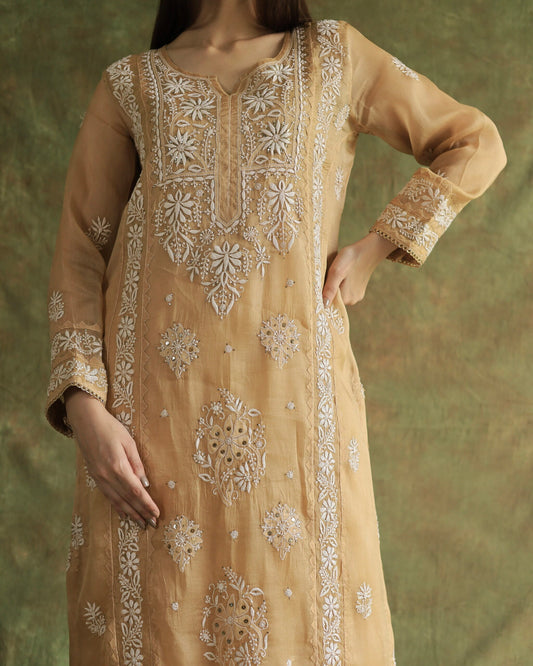 Beige Noor Organza Applique Chikankari Mukaish Kurta Dupatta Set