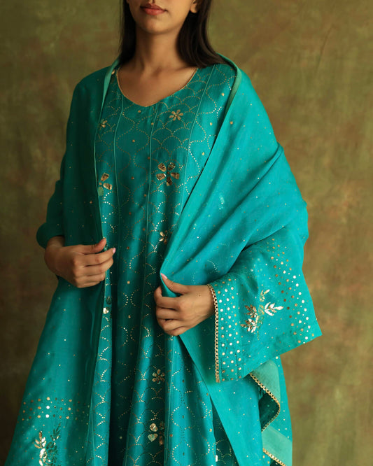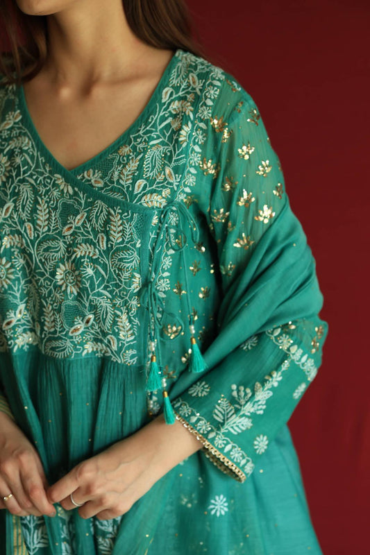Teal Green Malmal Mukaish Kamdani Chikankari Stitched Angarkha Kurta Dupatta Set