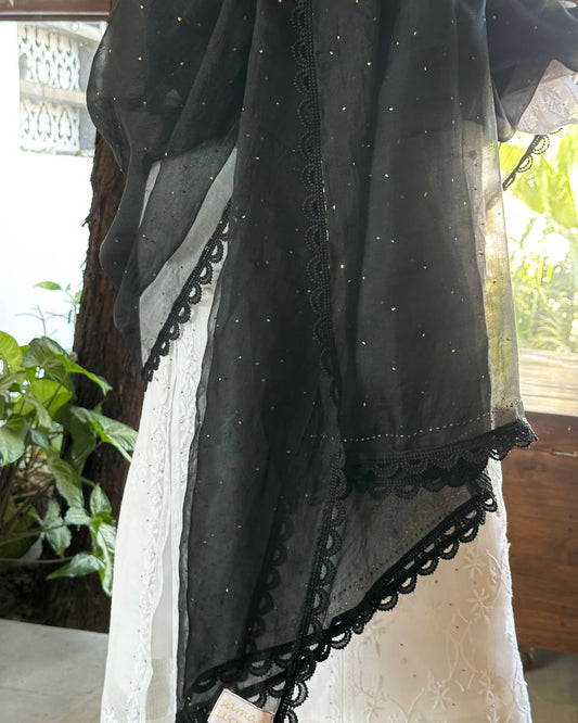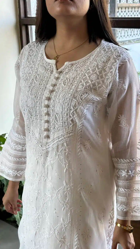 White Kota Chikankari Kurta With Mukaish Kamdani