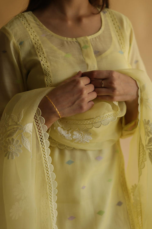 Lemon Yellow Jamdani X Chikankari Ready To Wear Kurta Dupatta Set