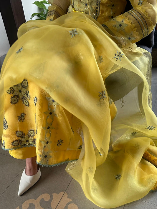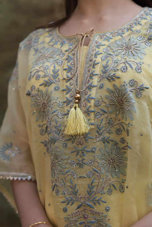 Mango Yellow Noor Organza Silk Chikankari Kurta Dupatta Set With Mukaish Kamdani
