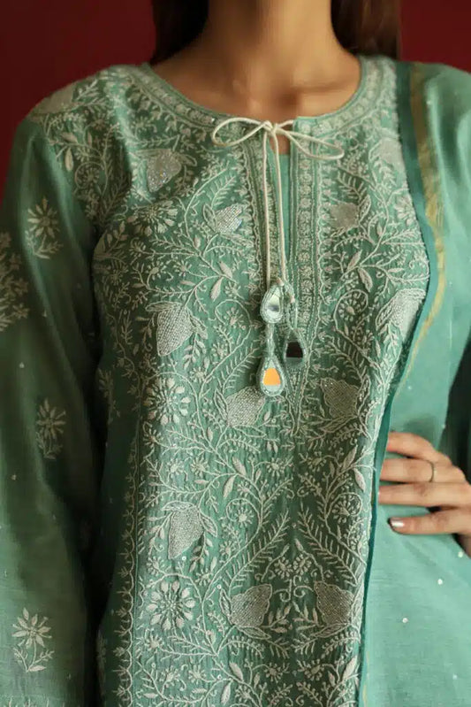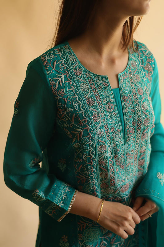 Teal Green Noor Organza Silk Chikankari With Mukaish Kamdani Work Kurta Dupatta Set