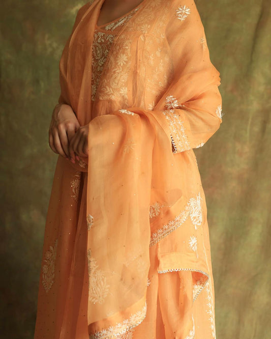 Orange Noor Organza Silk Fine Chikankari with Kamdani Ready to Wear Angarkha