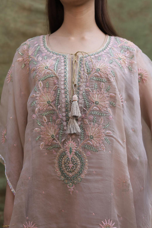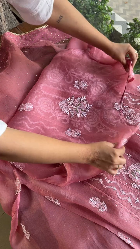 Pink Noor Organza Rose Motifs Applique Chikankari Mukaish Kurta Dupatta Set