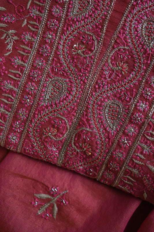 Cherry Red Shade Moonga Silk Chikankari Unstitched Fabric
