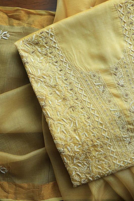 Yellow Paper Tussar Resham Chikankari Unstitched Kurta Dupatta Set