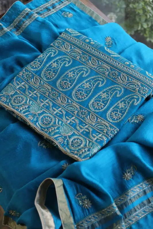 Blue Moonga Silk Chikankari Unstitched Fabric