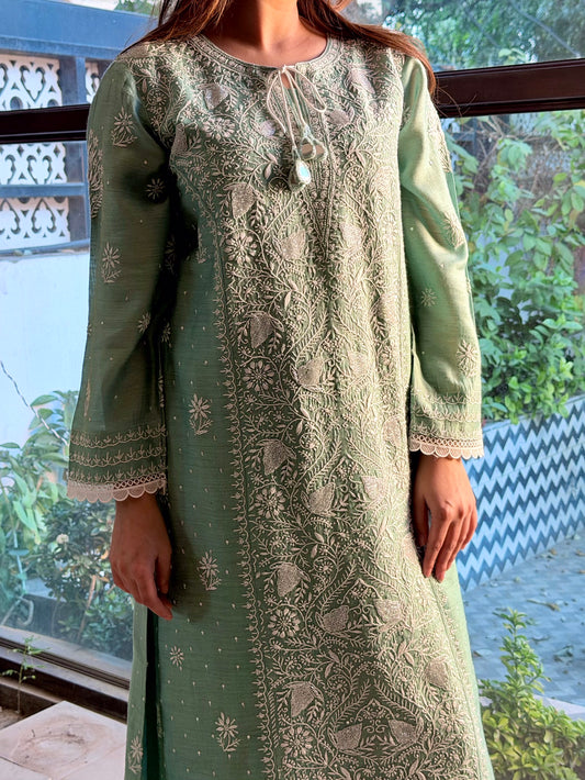 Mehndi Green Roheen Tissue Silk Chikankari Fabrics