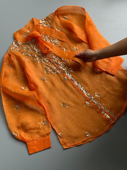 Orange Noor Organza Mukaish Badla Short Top With Bow Tie