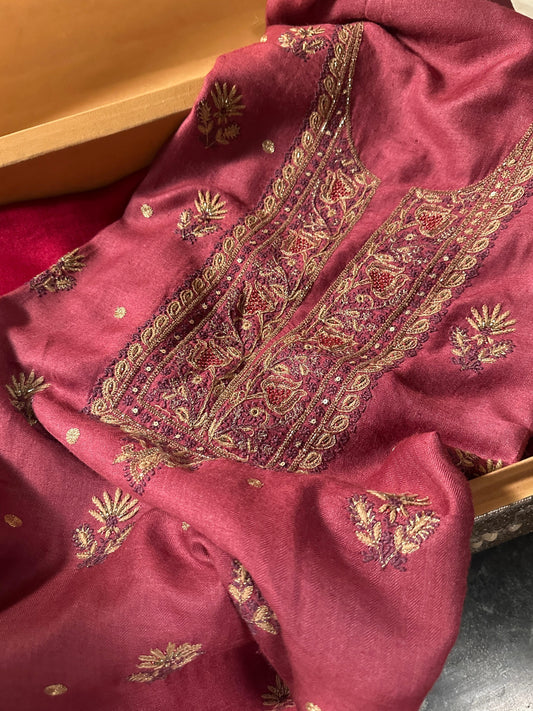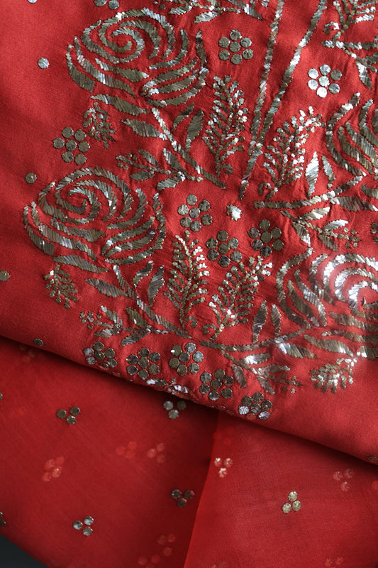 Brick Red Chanderi Silk Mukaish Badla Unstitched Fabric