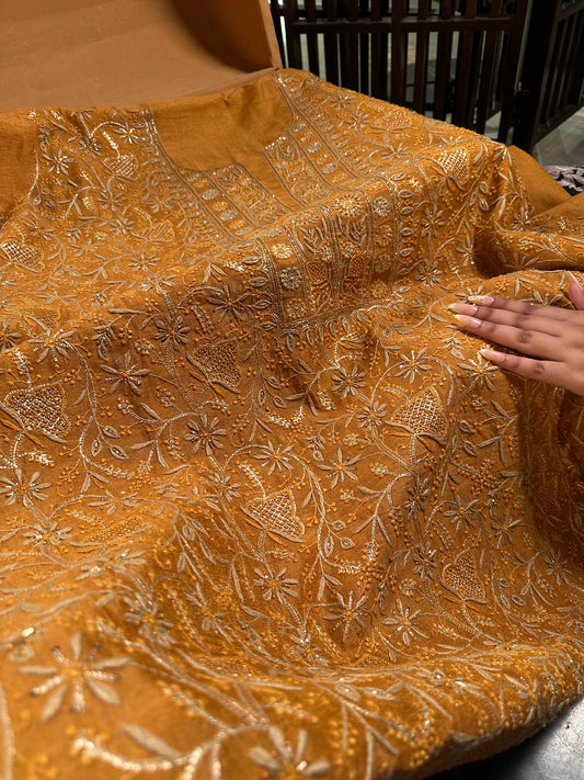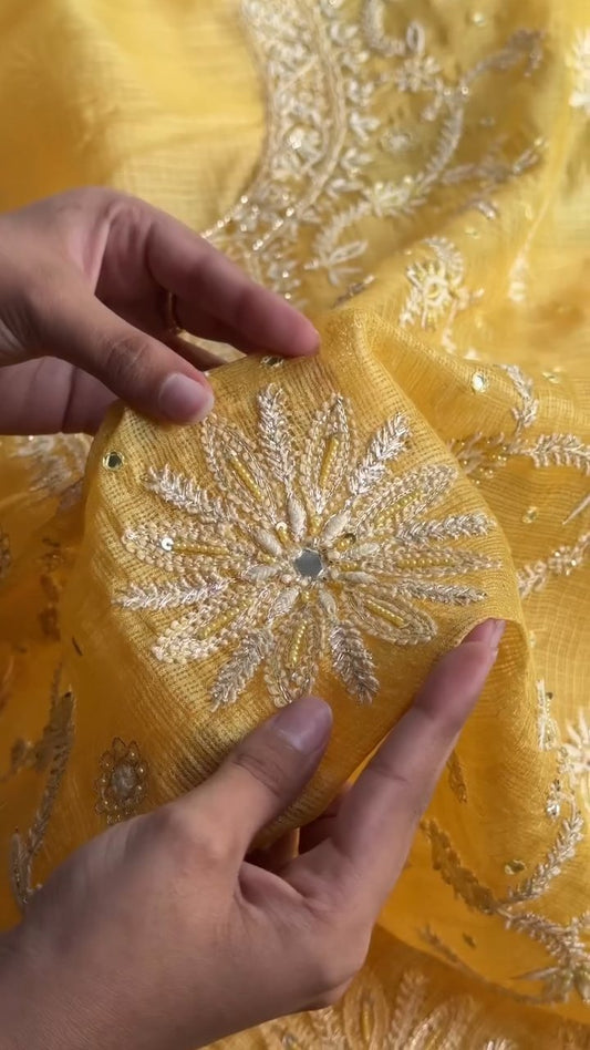 Yellow Mirror work Tussar Kota Chikankari Kurta set fabric