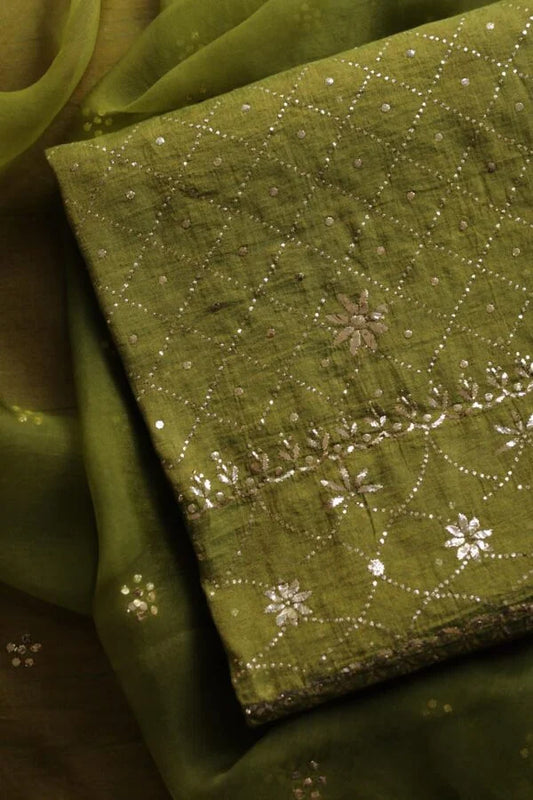Moss Green Mal Chanderi Silk Chikankari With Sequins Unstitched Kurta Dupatta Set