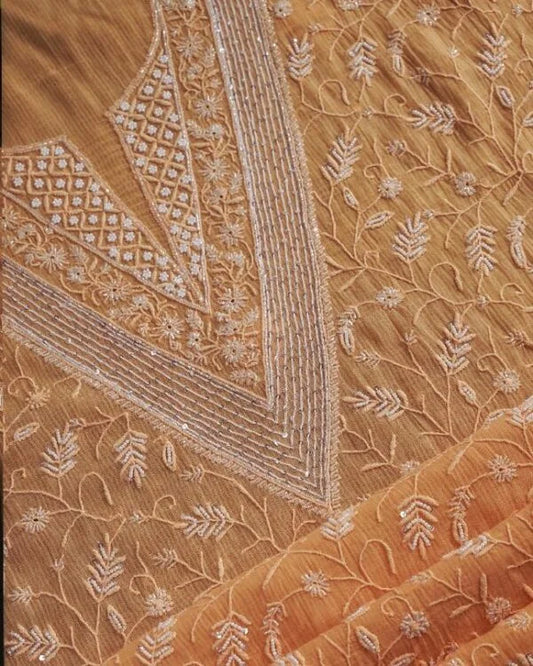 Orange Mul Chanderi Silk Chikankari With Sequins Unstitched Fabric