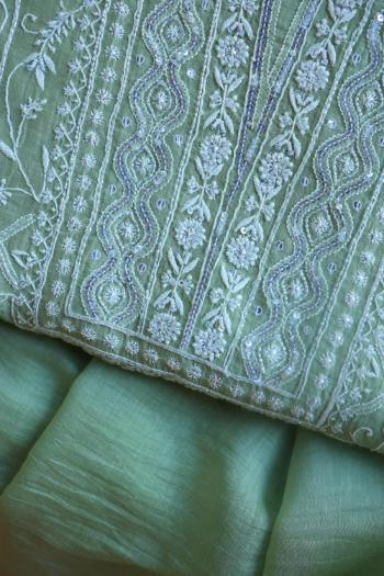 Pastel Green Mal Chanderi Silk Chikankari With Sequins Unstitched Kurta Dupatta Set